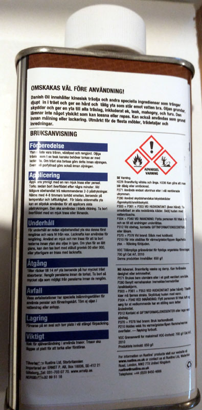 före oljan påföres. Danish Oil är lätt att använda. Den framhäver träets skönhet och ger en naturligt vacker yta som varar länge. Passar till de flesta träslag. 250 ml-flaska med barnsäker kork. 12 flaskor per ytterförpackning. Risk för självantändning! Använda trasor ska förbrännas eller blötas och läggas i en lufttät plastpåse.